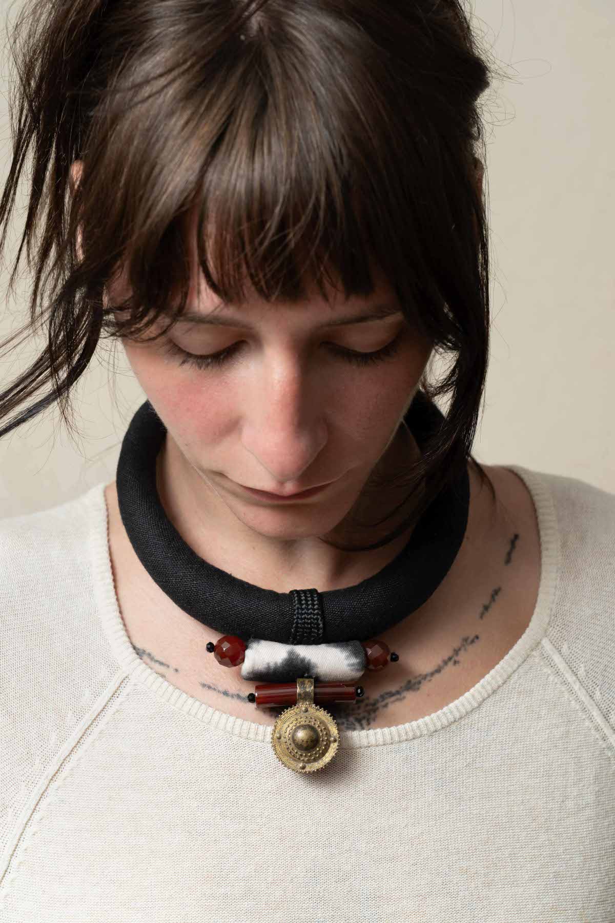 Choker made of black linen with clean and essential lines, while presenting interesting ethnic references. The central decoration plays with colors and textures; a soft element covered in black and white batik effect fabric, combined with two faceted carnelians, enhances the original vintage chiseled bronze pendant mounted on carnelian cylinders. Unusual and original, it was traditionally worn in Eritrea by young future brides.