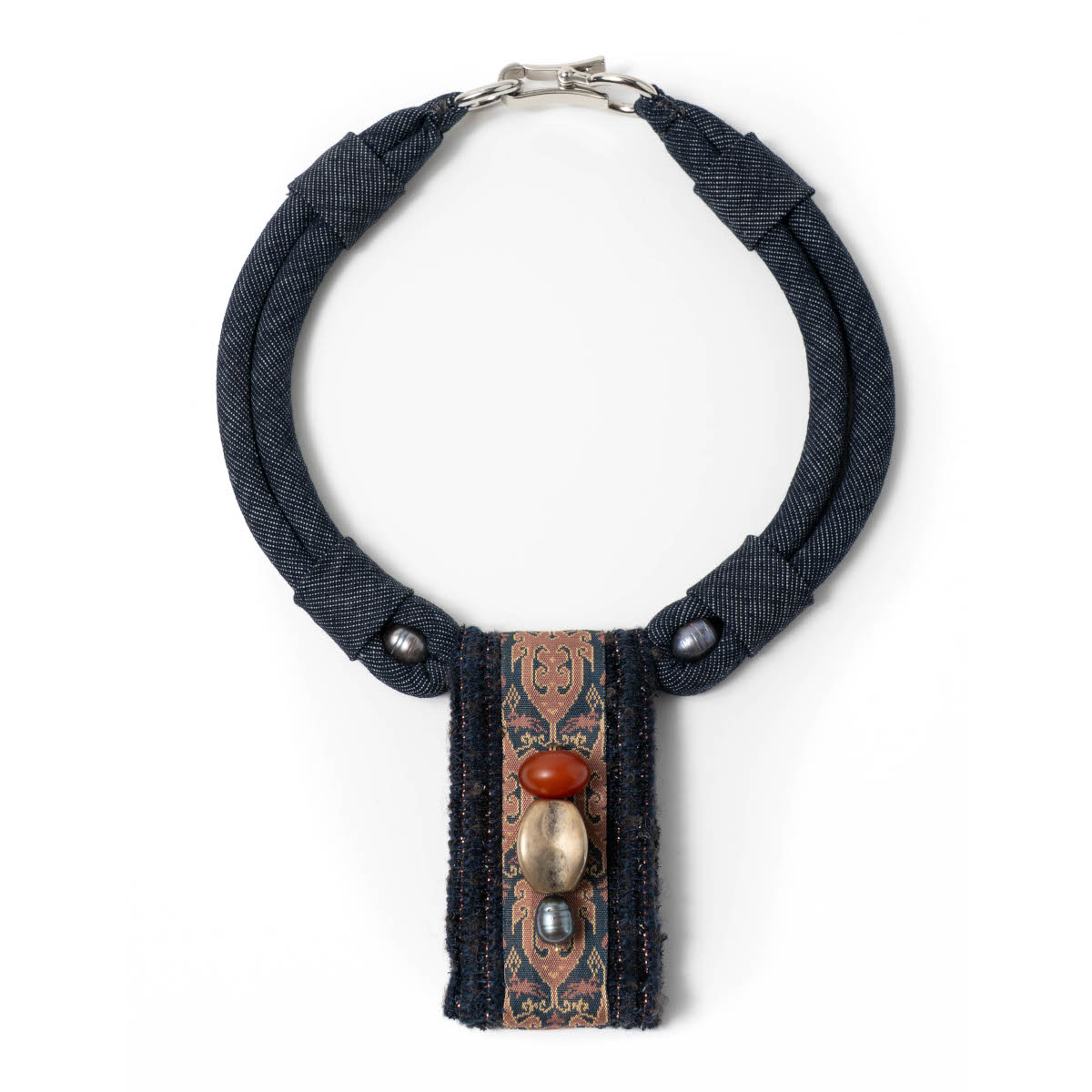 Handcrafted choker that combines fabrics and stones in a refined design; the midnight blue denim embraces the central element made of bouclé wool and Japanese pure silk. The warm and cold shades reflected in the gorgeous motif are enhanced by a Tibetan amber, striped gray freshwater pearls and an original matt golden brass bead.