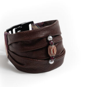 Leather bracelet, original and unexpected; a little rock, a little ethnic, it combines the grit of leather with the delicacy of Uzbek silk. Faceted garnets and gray freshwater pearls embrace a vintage glass paste chevron pattern bead.