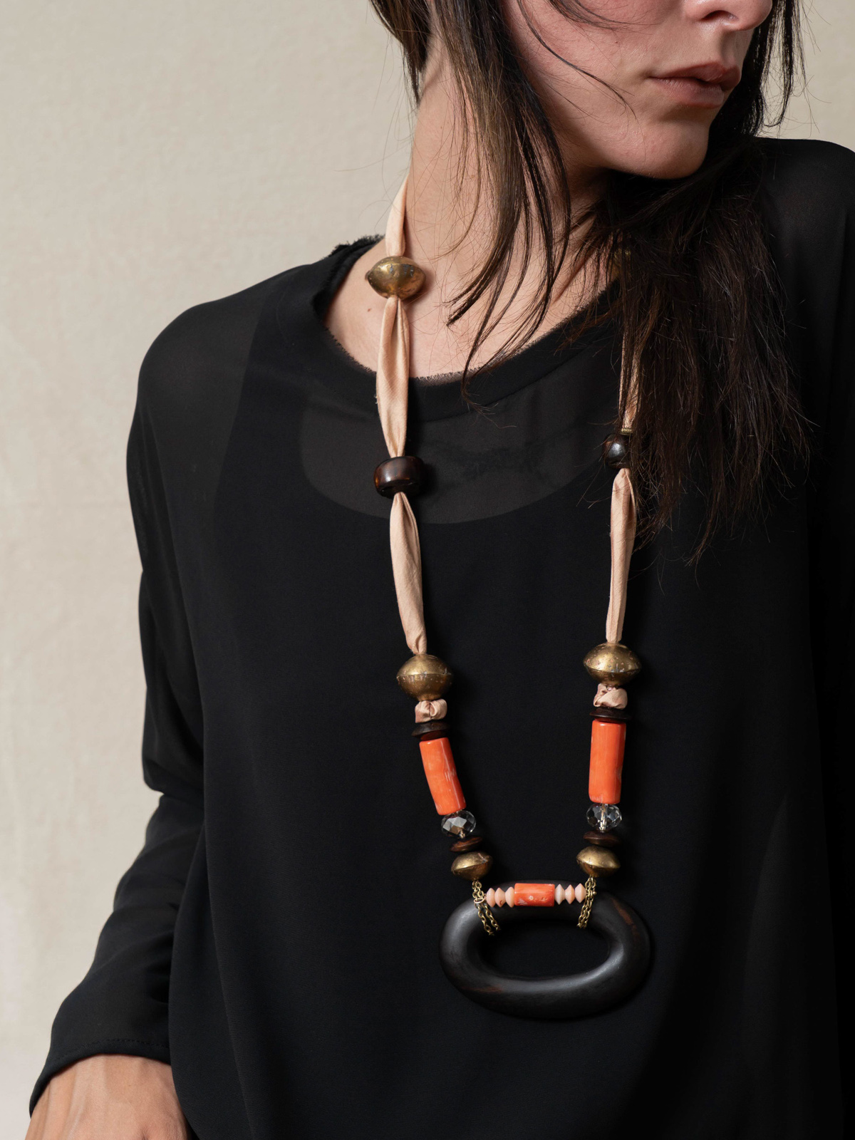 Unusual and rich in details, this peach-colored shantung necklace has the ebony pendant as its focal point, emphasized by the combination of coral bamboo in pink and orange shades. Large Tuareg biconical brass beads, ebony discs and crystals are alternated with dyed bone elements while at the top a silk element completes the necklace. The South and East of the world come together in a jewel of great impact and original design, in harmony with the aesthetics of the “Crossing Paths” collection