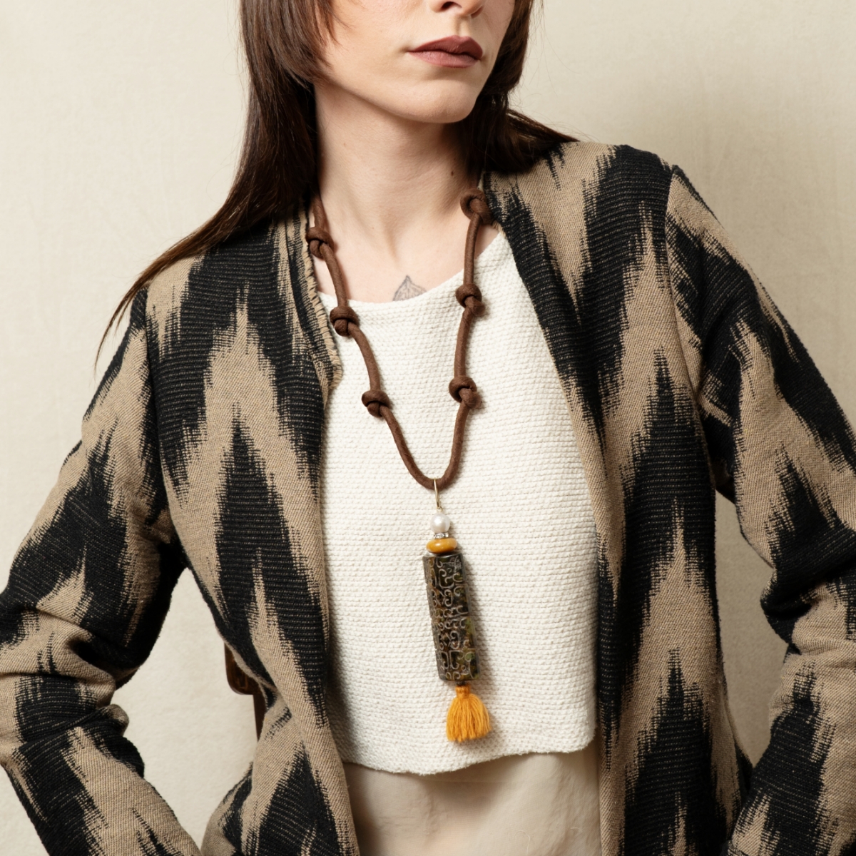 A Tribal Beat jewel is an original and out of the ordinary accessory, a tribute to women with an unconventional taste. Each jewel is designed and handmade with high quality materials. It is the result of Silvia's careful research. She produces her creations in a single item or a limited number of pieces to best represent the uniqueness of each woman.