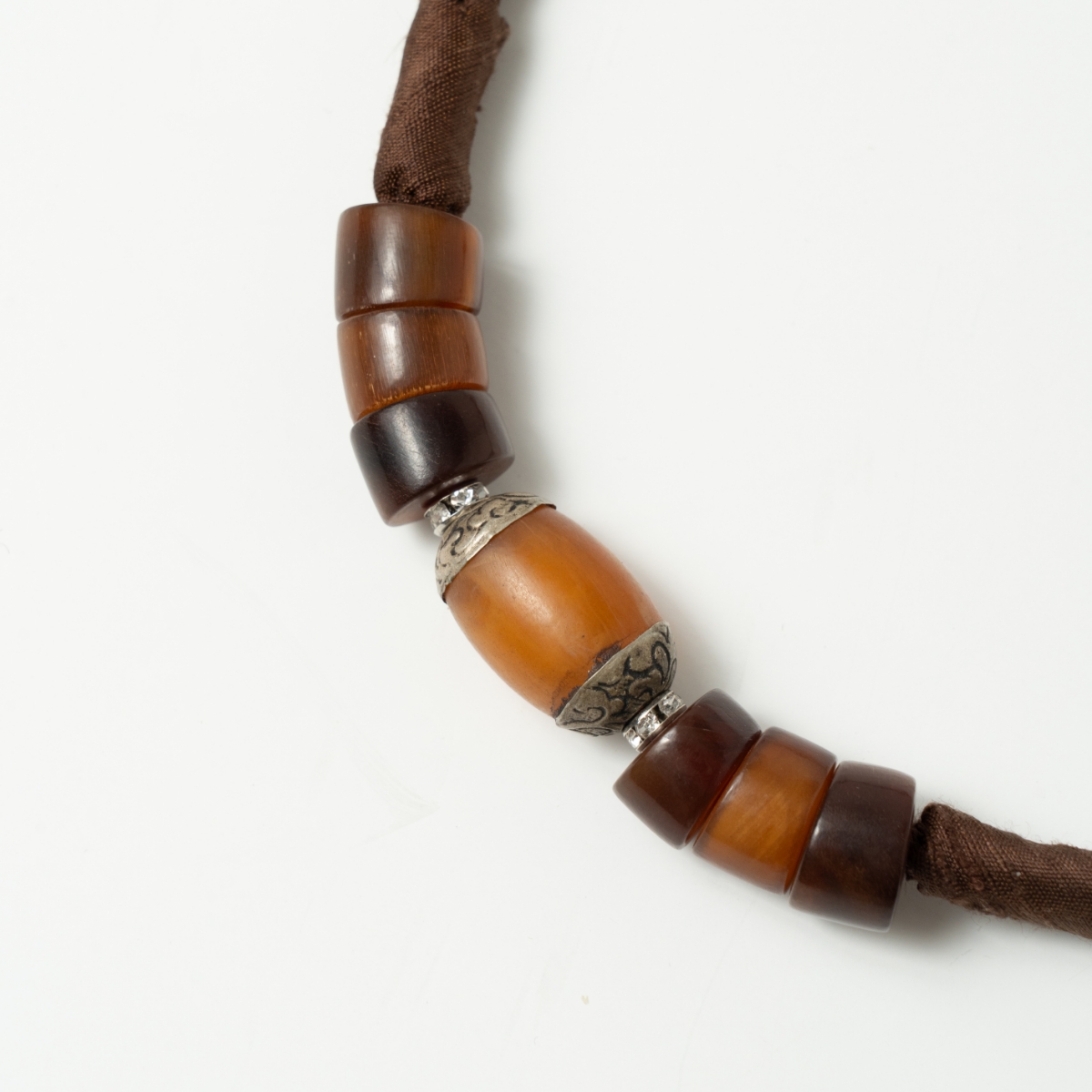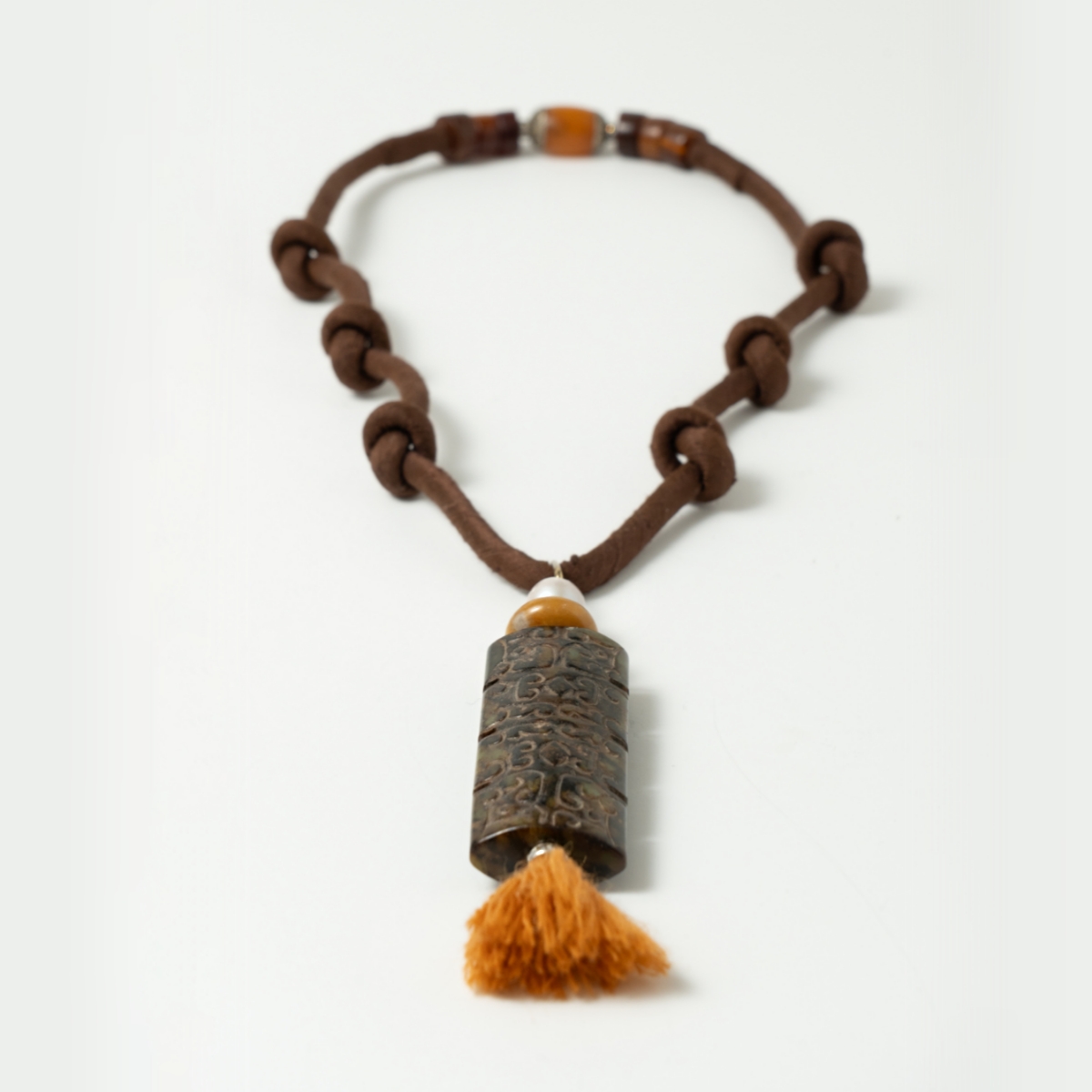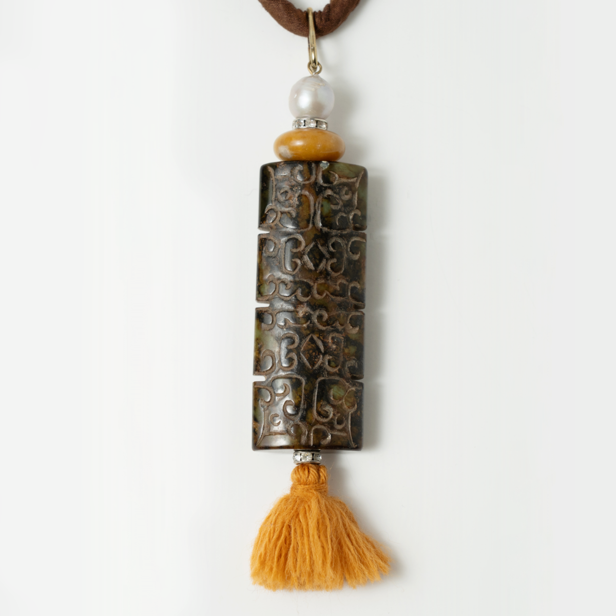 This cocoa brown shantung necklace features a unique and captivating design. The eye is instantly drawn to the large brown jade pendant, masterfully carved on both sides, its rich tones beautifully contrasted by the vibrant glow of an opal disc and the luminous sheen of a large freshwater pearl. A playful tassel and sparkling rhinestones add a light, whimsical touch and bring movement with every step.