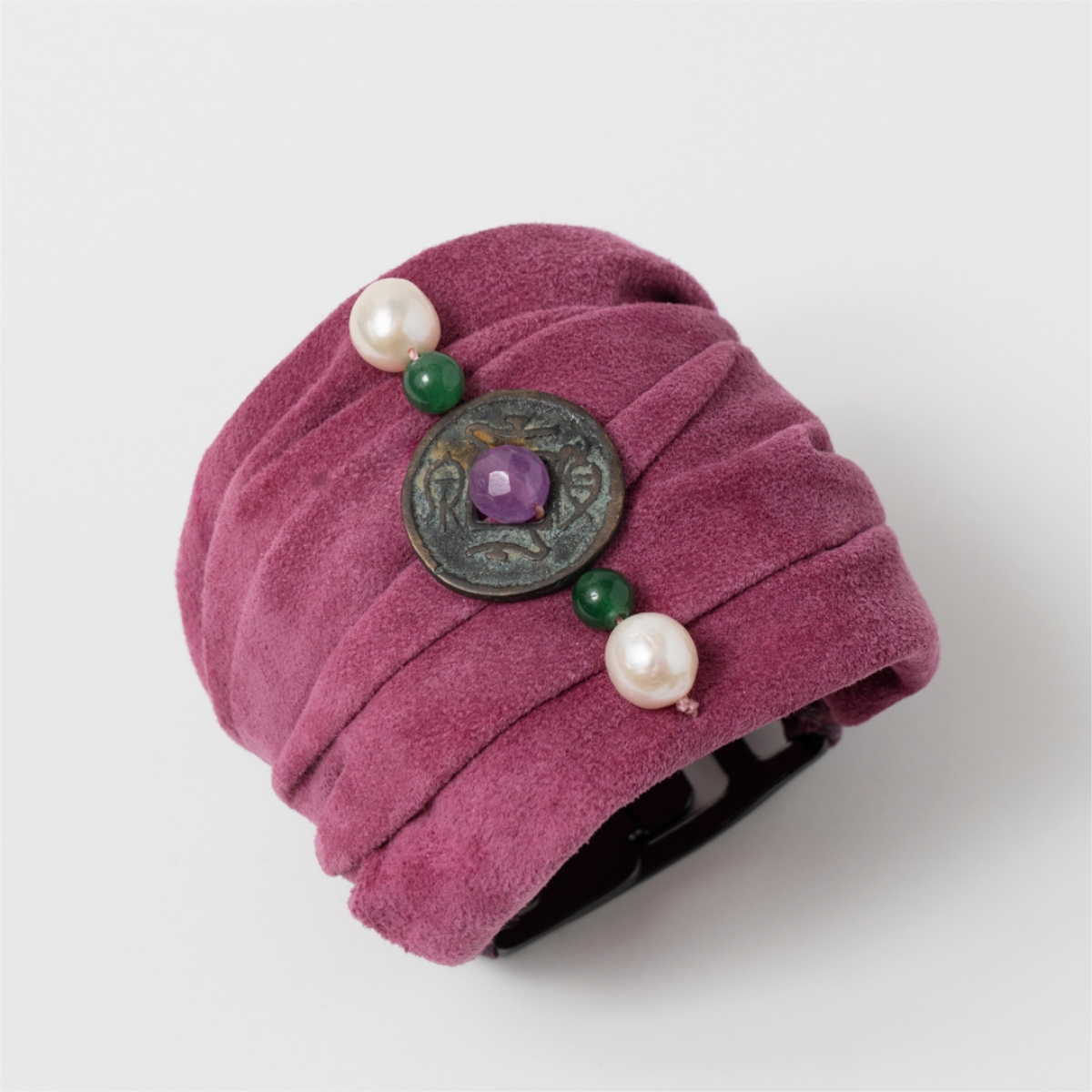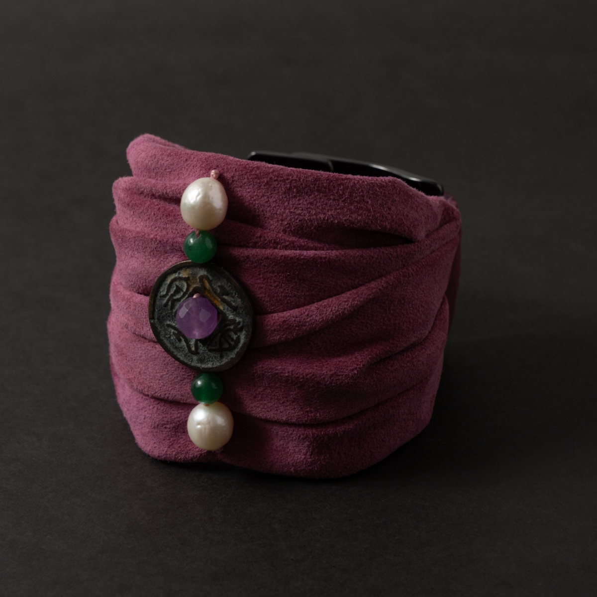 This bracelet is a vibrant blend of textures and cultures, ideal for those who love bohemian style with a historical touch. Made in rich pink suede, its soft texture beautifully contrasts with the aged patina of an antique Japanese coin.