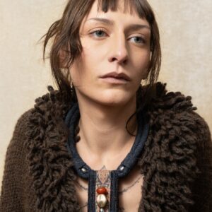 Dettaglio materiali:  denim, lana, seta, ambra tibetana, perle, ottone
